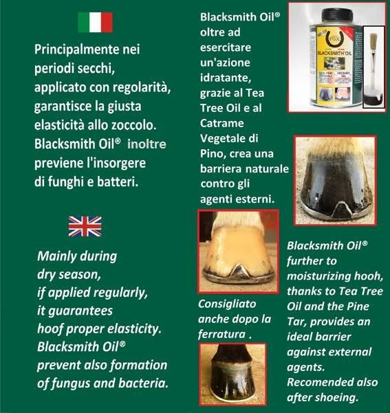 Zvlhčující olej složený pouze z rostlinných výtažků. Pokud se aplikuje pravidelně, tak přináší a udržuje kopytům jejich přirozenou pružnost. Kromě zvlhčujícího efektu zabraňuje také pronikání infekce do kopyta - obsahuje tea tree olej a borový dehet. Během suššího počasí se doporučuje mazat olejem kopyta po kování.