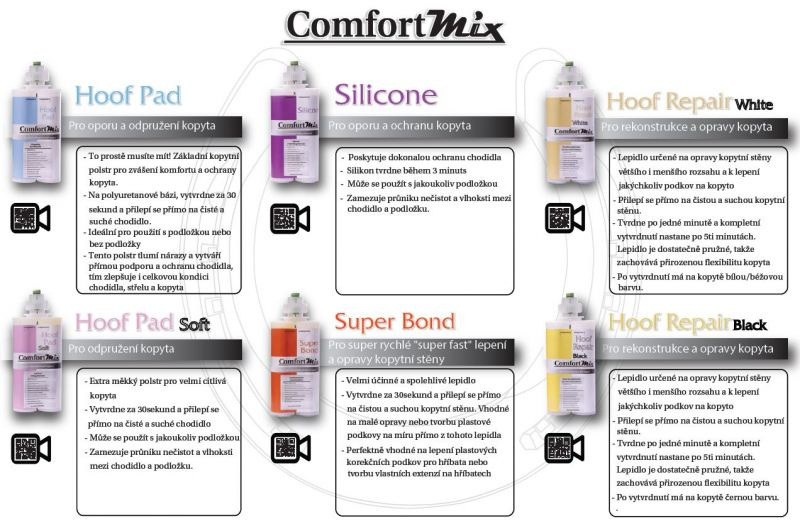 Comfortmix: Lepidla na kopytní stěnu a polstry na vyplnění chodidla.