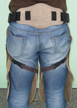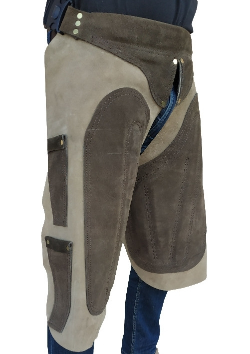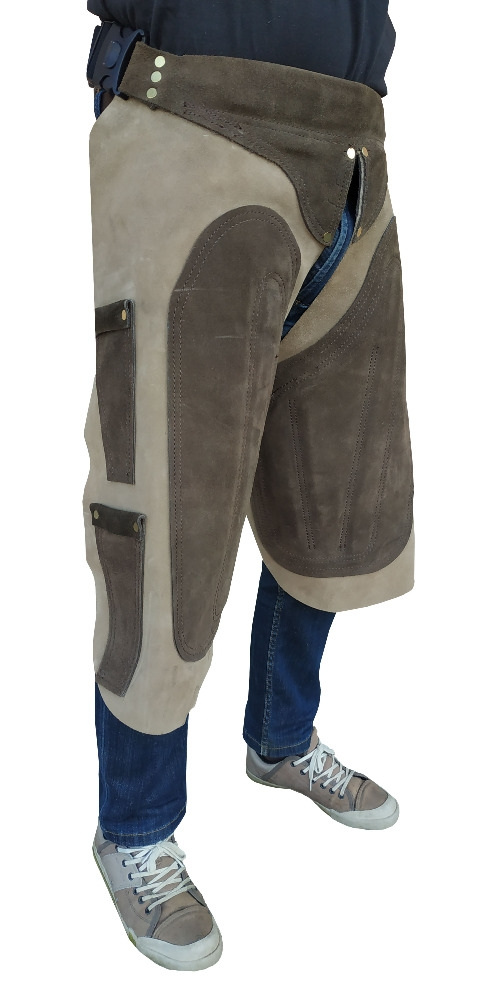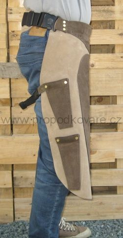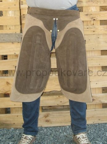 Osvědčený model podkovářských zástěr. Typ s vykrojeným klínem, který umožňuje snažší pokleknutí. Zástěra je vyrobena z kvalitní kůže a má speciální polstrování na stehnech pro komfortní práci. Pružný pás kolem pasu je vybaven bederní oporou. Je dostatečně trvanlivá, pevná, komfortní a lehká. Má 2 kapsy na nože a 2 kapsy na magnety. Zapínání kolem pasu a stehen pomocí plastových přezek.
