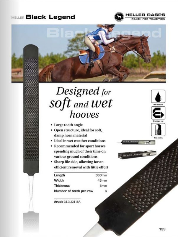 Rašple Heller Black Legend je rašple hruběji sekaná, podobná rašpli Heller Legend, proto je vhodná pro měkčí a vlhčí rohovinu Heller Black Legend se liší od Heller Legend speciální povrchovou úpravou, která zajišťuje větší odolnost proti opotřebení a napomáhá snadnějšímu vypadávání rohoviny ze zubů rašple při rašplování. Rašple je vhodná pro celou škálu použití a zejména tam, kde koně tráví většinu času venku, kde jsou kopyta plná písku a nečistot, což má negativní vliv na opotřebení rašple. Pilníková strana je velmi ostrá, umožňující efektivní pilování s minimálním úsilím.